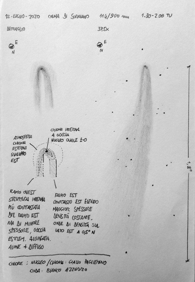 Io l’ho osservata al tramonto il 14 luglio col 25cm a 30x, 60x, 87x e 133x ma non ho preparato il report. Comunque non ho notato tutti i dettagli da te visti, la cometa ha perso un po’ di luminosità, era ancora immersa nel chiarore del tramonto, e bassa su un orizzonte pieno di velature :( comunque bellissima. Nucleo luminoso immerso nella chioma, coda enorme soprattutto in distolta, doppio attacco sul nucleo con quello NE più luminoso, colore giallo, un lato della coda più dolce e curvo l’altro più spigoloso, coda ionica separata e appena percettibile.