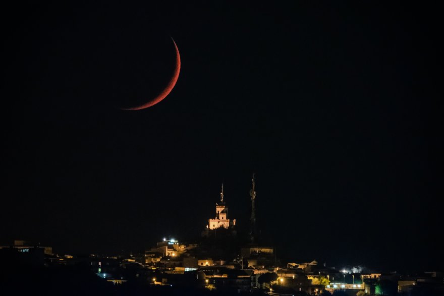 Falcetto di Luna crescente (7,6%) al tramonto sopra Torre Semaforo di Belvedere - Siracusa