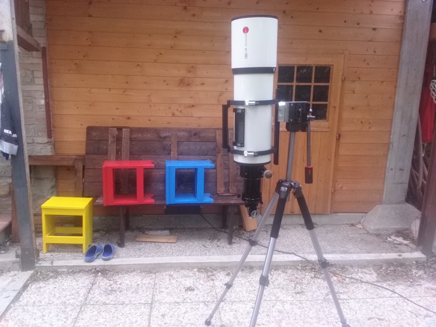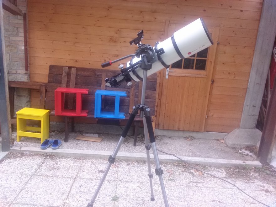 Con telescopi più pesanti, come quello nelle foto ad esempio, per sicurezza regolo un po' più corto il piede opposto al telescopio, giusto per sicurezza, per limitare il pericolo di ribaltamento. Si tratta di un discorso limite però, con tubi piccoli non c'è nessun problema. Almeno per ora....