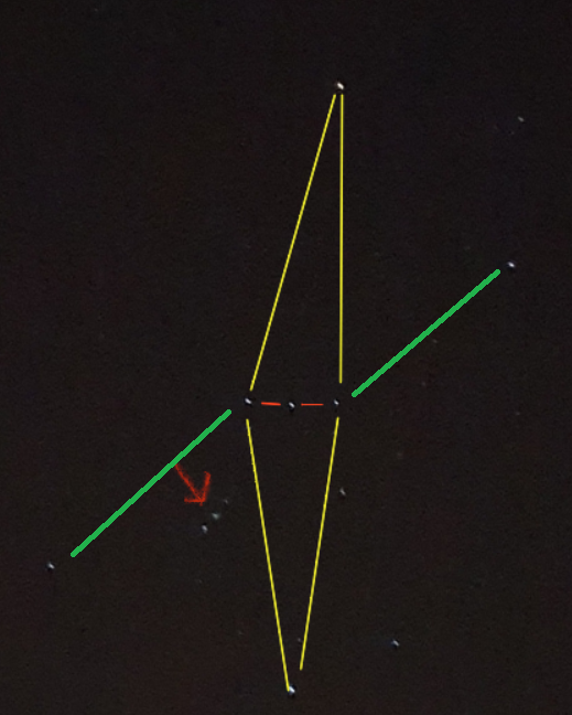 come vedi cosí ha una forma molto intuitiva con una certa simmetria, quello giallo é l'aquilone,le tre stelle allineate al centro sono la cintura di orione le linee in verde sono sempre parte di Orione,Se guardi bene dove indica la freccia rossa hai fotografato la grande nebulosa di orione.