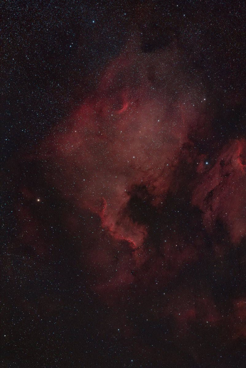 Poi, a mezzanotte passata da un po' ho visto prima Vega e poi a fatica ho riconosciuto Deneb, a 12° d'altezza dall'orizzonte. Purtroppo il campo visivo della mia postazione č limitato, cosė dopo che le due galassie si sono eclissate dietro al balcone, ho puntato la pių classica delle nebulose estive: NGC7000