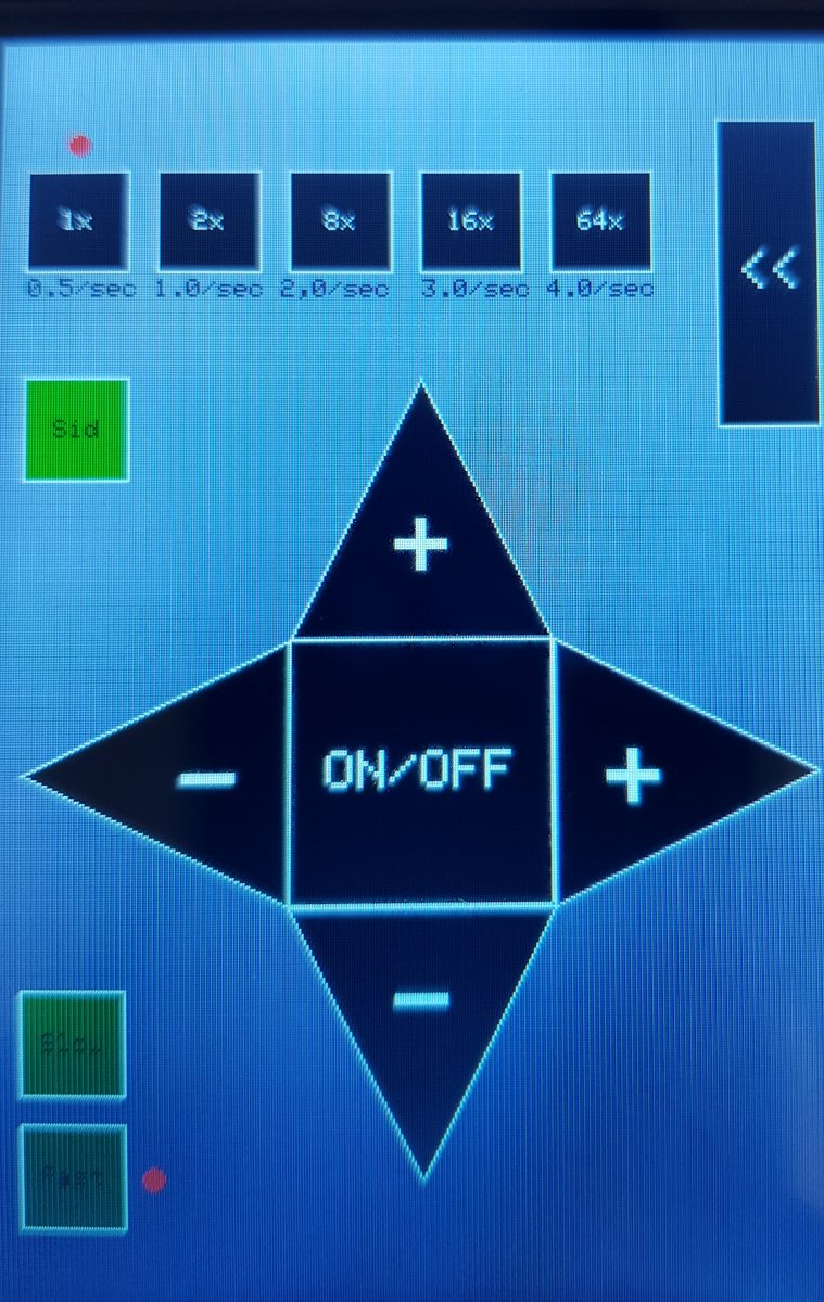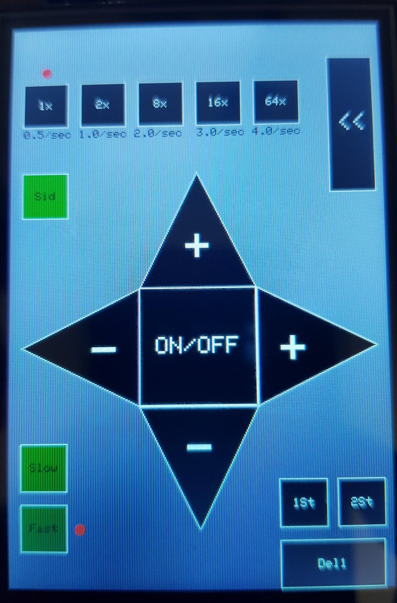 3) Il controllo manuale, da schermo touch (niente Joystick). Velocità selezionabili 5 fast (0,5 - 1 - 2- 3 e 4 gradi/sec) e 5 slow ( 1 - 2- 8- 16 - 64 x vel. sid.)
