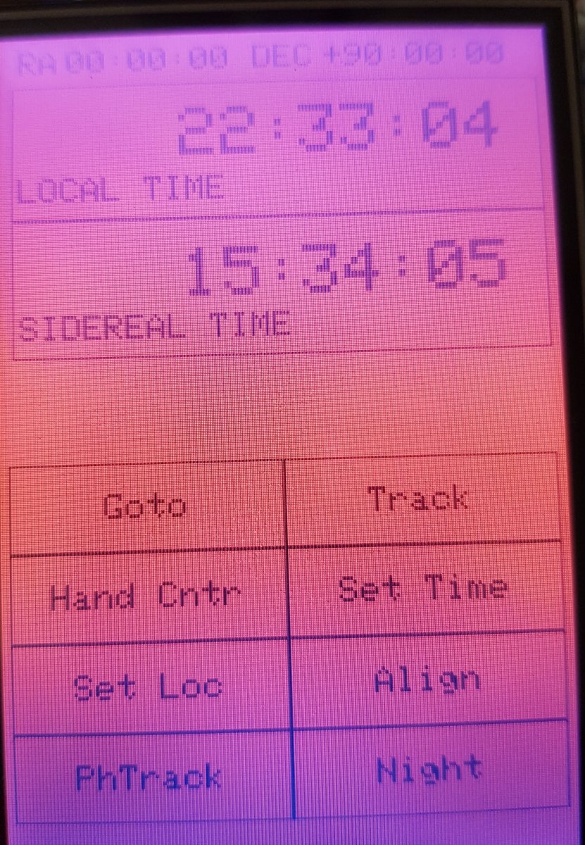 Da notare sul quadrante: in alto la barra che indica le coordinate AR e Dec di puntamento del telescopio, in basso le coordinate dell’osservatore. La barra di puntamento del telescopio comparirà anche nei sotto-menu, per fornire una informazione aggiornata all’operatore in qualsiasi modalità.