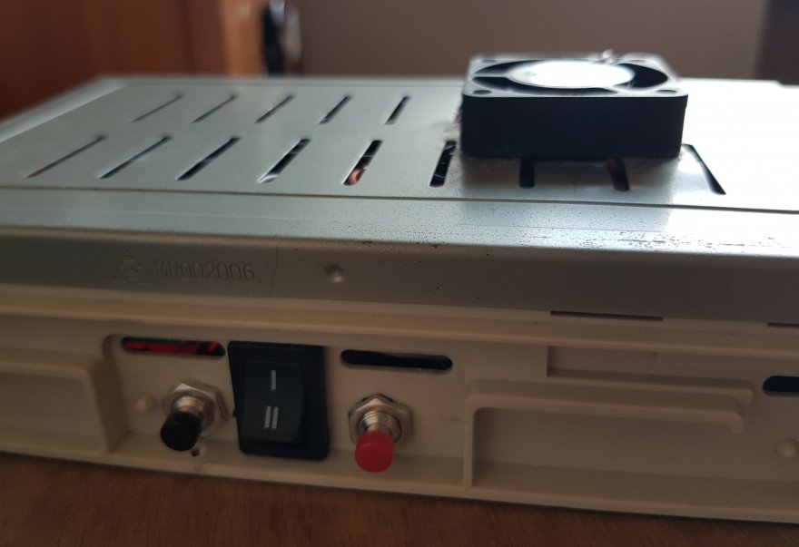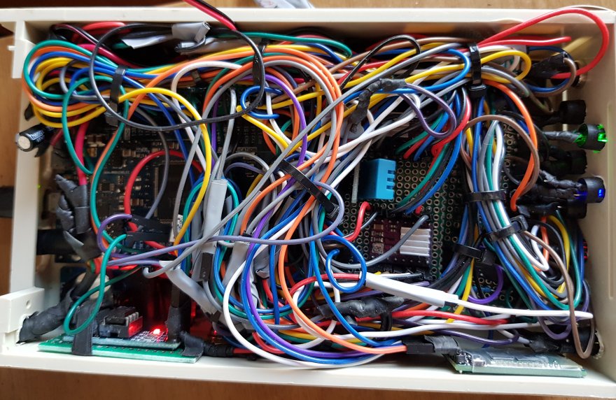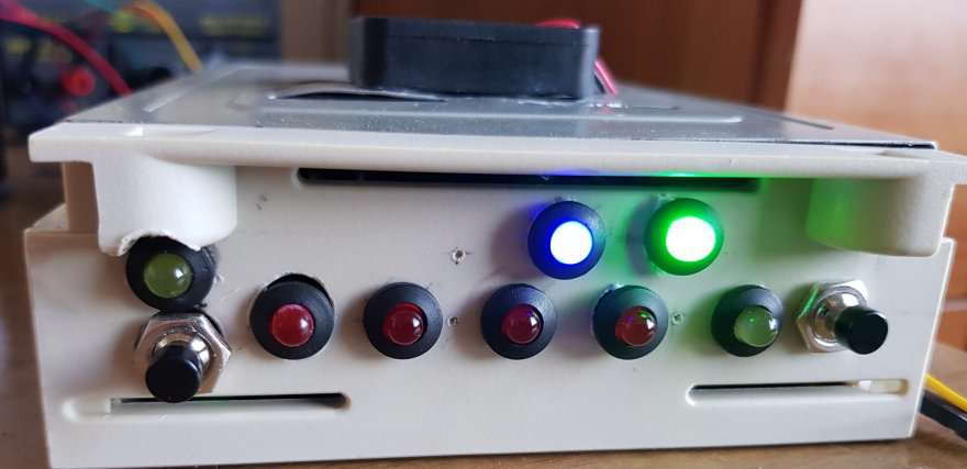 Sulla dx il cuore di FreeNights (che di seguito chiamerò semplicemente FN), con in evidenza le spie di controllo e i pulsanti di fine funzione. Naturalmente tutti i comandi sono sul controllo remoto, ma in questa fase ho preferito duplicarli, non si sa mai. Spesso difatti i TFT, soprattutto quelli economici, hanno piccoli problemi di debouncing, seppure allo stato attuale penso di averli risolti.