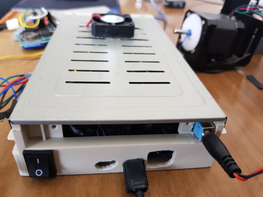 All’interno possiamo notare, tra la selva dei cavi, in basso a sx la memoria esterna EEPROM, che usiamo per memorizzare i nostri settaggi sulla posizione senza doverli ogni volta reinserire. Sul fondo, sotto la EEPROM, l'RTC. Sotto i cavi in alto a sx (non si vede!) il relè di azionamento della ventola di raffreddamento, in basso a dx il modulo HC-05 del Bluetooth, al centro a dx il millefori con i due driver DRV8825 e il sensore di temperatura che, in automatico, aziona la ventola al raggiungimento dei 40°.