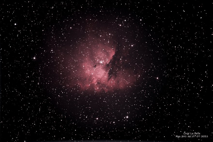 Salve , in una serata limpida di alcuni giorni addietro ho effettuato la mia prima ripresa su una nebulosa . Ho ripreso la nebulosa NGC281 PacMan , dalla forma inconfondibile. Ho utilizzato il newton 200 800 f4 su montatura Heq5 pro , con camera Asi 294 mc pro color, evoguide 50 e asi 120 mc s per la guida ,tutto guidato dall' Asi air pro . Ho realizzato 60 foto da 180 sec gain 200 , 10 dark e elaborato con DSS e Photoshop . Buona serata . Che ne pensate?