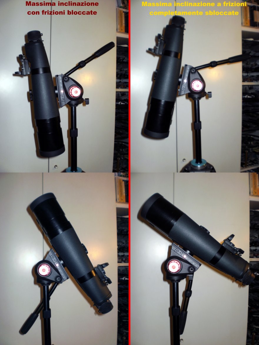 In breve a frizioni "aperte" non regge il 22x70 (4 kg), alla minima inclinazione (5/10°) il binocolo se ne "casca" fino a battuta (sia in avanti che in dietro), ma non solo, anche il ben più leggero 30x80 (2,5 kg) ad inclinazioni superiori ai 25/30°, comincia anche lui a cascarsene fino ad arrivare in battuta.