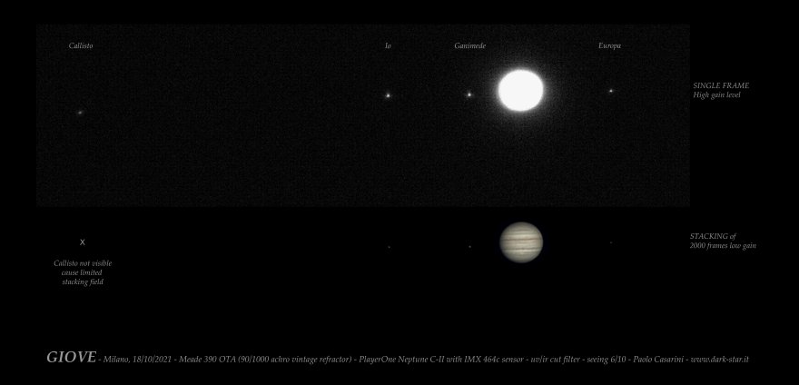L'immagine è un collage di due diverse fotografie. Una di "singolo scatto" con valore di gain alto per evidenziare i quattro satelliti galileiani, l'altra è lo stack di 2000 frames a valori di esposizione corretti per il pianeta.