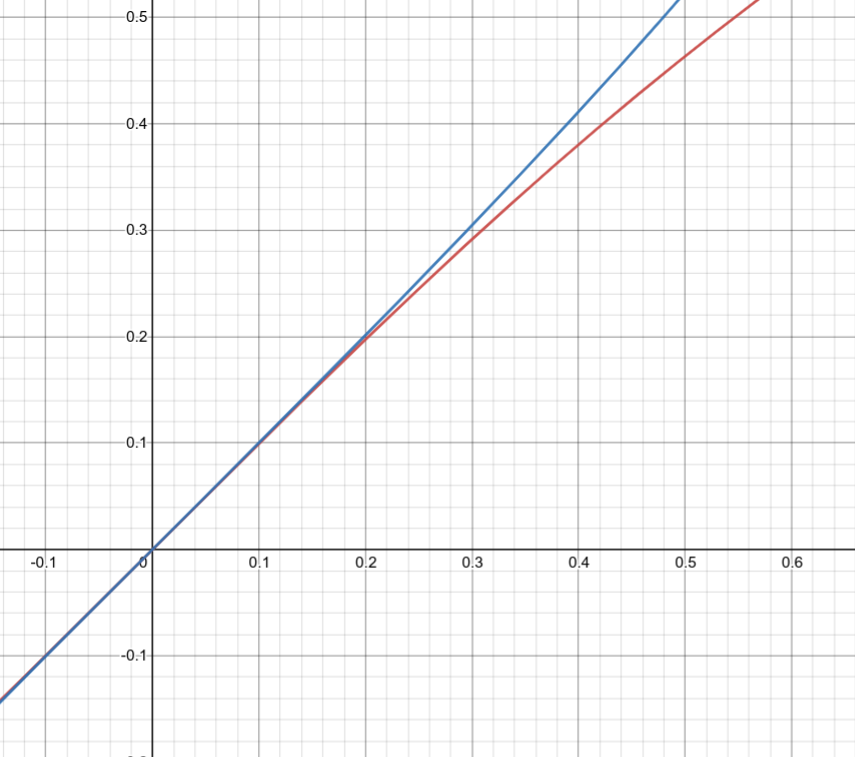 Avendo considerato che la distanza Terra-Sole sia molto maggiore del raggio del Sole, il nostro rapporto sarà ovviamente molto minore di 1. Nell'immagine che ti allego, la linea rossa rappresenta la funzione arcotangente mentre quella blu è l'arcoseno.