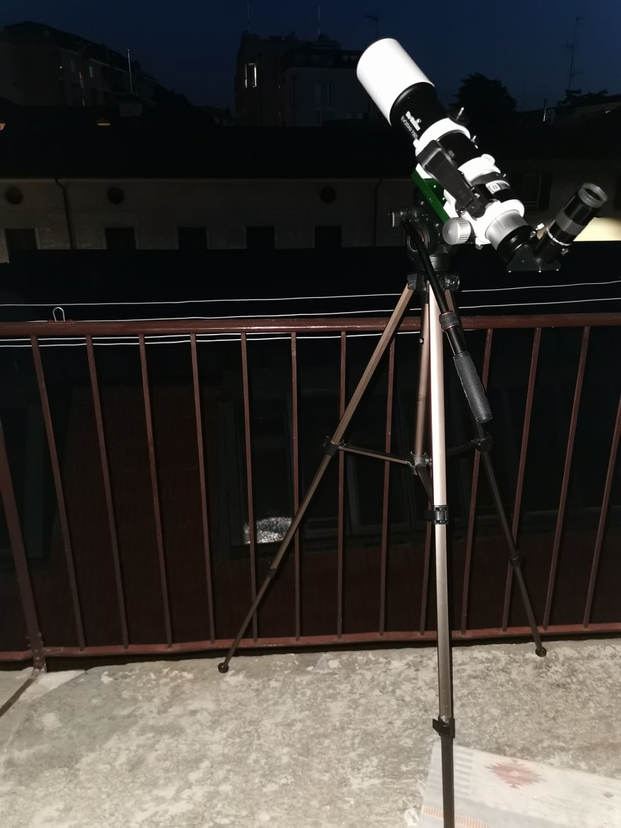 Come vedi è piccolo, compatto e sta su un cavalletto fotografico leggero, il paraluce si può estrarre per ridurne la lunghezza (a patto di mettergli un tappo per proteggerne la lente frontale), il solo tubo pesa 2kg a cui aggiungi 1 kg di attrezzatura varia (diagonale, oculari, filtri.