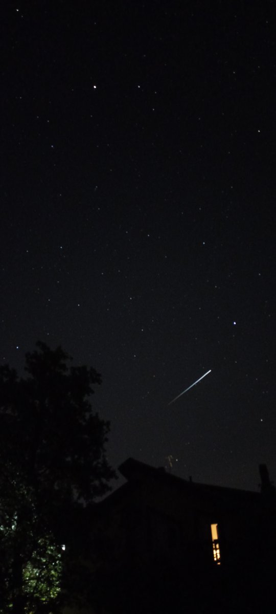 Ieri dovendo pernottare fuori per lavoro, nei pressi del Pollino prenoto presso un agruturismo non molto lontano dall'A3. Posto incantevole e lontano dalle luci. Dopo cena esco fuori e le luci dell'agruturismo erano spente. Cielo bortle 3/4 direi. Stelle tante, spettacolo incredibile. Ad un certo punto, poco prima delle 22:00, vedo passare un punto luminoso, sarà la Iss, controllo velocemente sul cellurale ed era lei. Cerco di fare delle foto appoggiando il cellulare alla meglio e fortuna vuole che riprendo anche un bel bolide. Un bel colpo di fortuna.