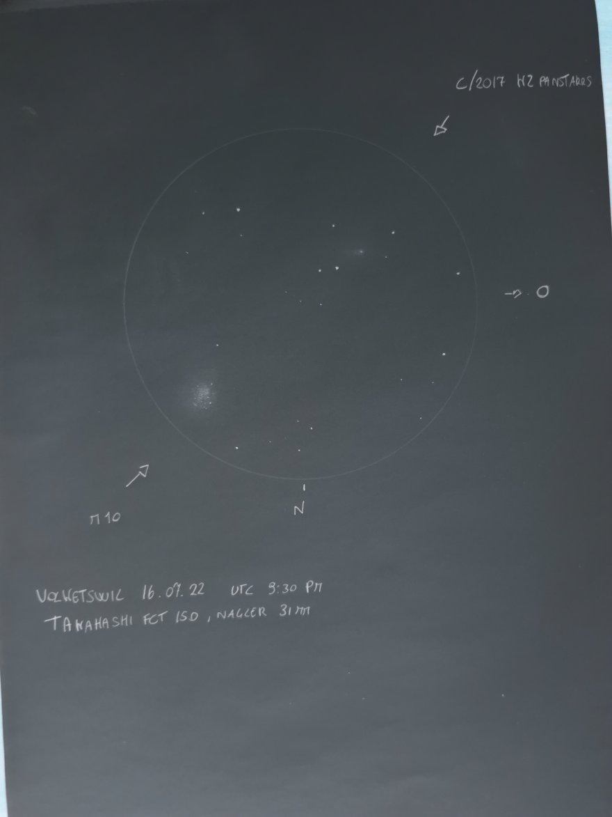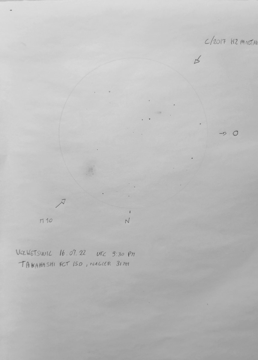 Ho osservato prima a circa 30x, e poi man mano sono salito fino 130x. A questi ultimi ingrandimenti la cometa si palesava con una forma leggermente ovale e con un nucleo globuloso. Mi sono preso la licenza di rappresentarlo nel disegno, in realtà appariva solo come una piccola nuvoletta meglio visibile in distolta all' ingrandimento di 30x