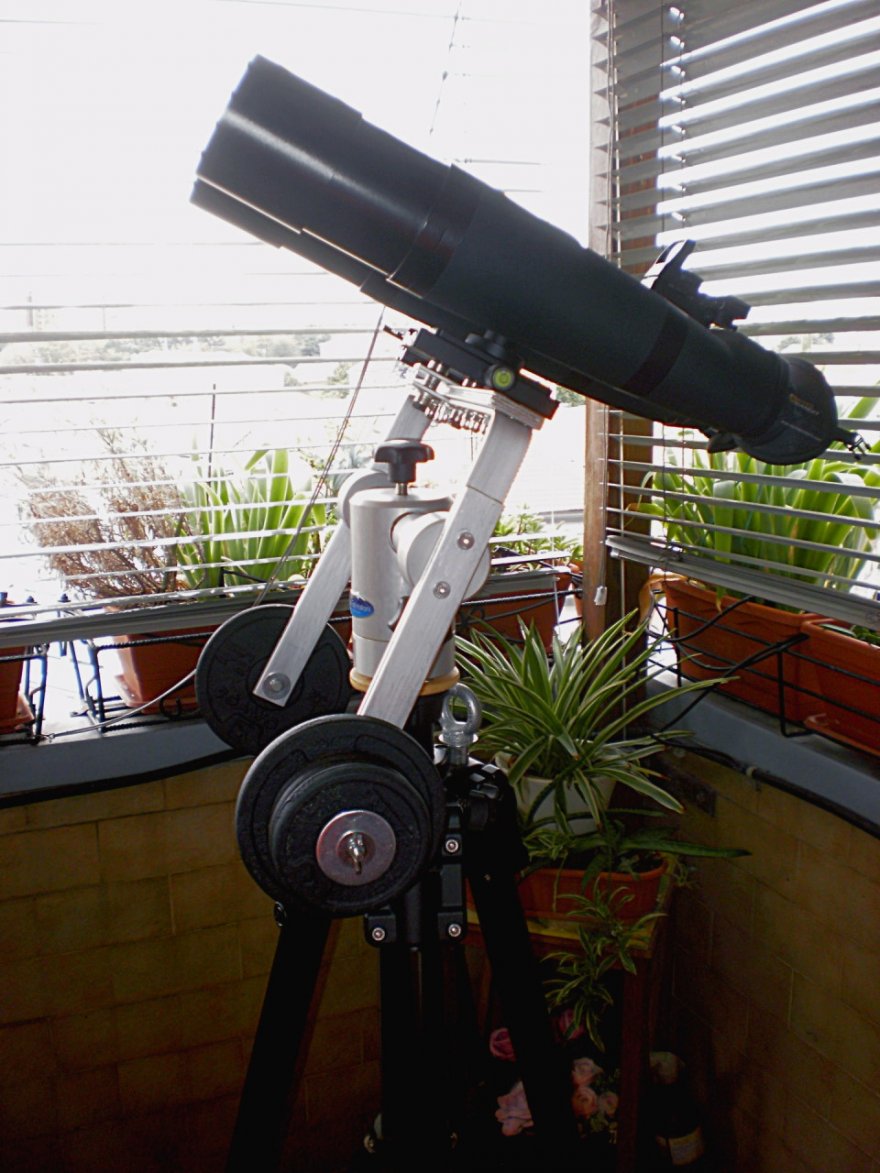 Fatta la prova di "stress" con il C8, apparecchiato (con revolver e 4 oculari) supera di poco i 6 kg, ma soprattutto il braccio di leva è maggiore, essendo il baricentro più lontano (il tubo è più largo), infatti il rapporto carico/leva quasi 1,6 a 1, infatti ho dovuto mettere ben 10 kg di contrappesi e l'aggeggio ha subito mostrato i suoi limiti.
