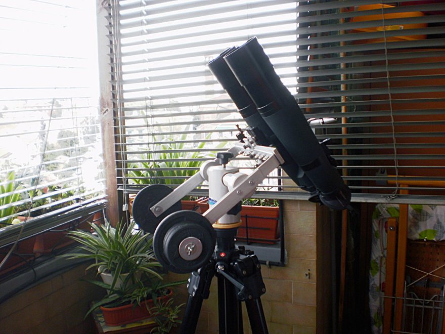 Alla fine sono soddisfatto, il binocolo con 5 kg di contrappesi è perfettamente bilanciato, nelle immagini le frizioni sono completamente aperte e i 10,5 kg totali (staffa + bino + pesi) vengono portati senza problemi dalla Giro3, il manfrottone ovviamente non ha problemi a portare i 14 kg abbondanti di tutto l'ambaradan, con il classico colpo al tubo (di nocca, bello deciso), le vibrazioni si stoppano in un secondo scarso (con l'apetto ancora meno).