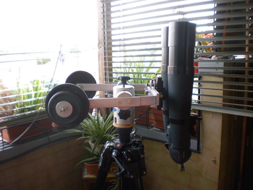 Vi ho collegato il WO 22x70 e come speravo il tutto è solido (ha richiesto 5 kg di contrappesi, con rapporto carico/leva pari a 1,25:1 ), il morsetto fa il suo dovere, ho forzato il binocolo con le mani sia longitudinalmente (per vedere se scorreva la barretta da 100 mm che equipaggia il bino) che lateralmente, per vedere se c'erano cedimenti e pare sia tutto a posto, ancora meglio con l'apetto (ovviamente, vista la barra lunga 180 mm che prende tutta la lunghezza del morsetto offrendo un'ottima presa).