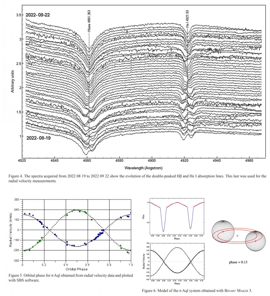 Lo studio è in corso di pubblicazione su JAAVSO 51-1 dal titolo "Spectroscopic and Photometric Study of the Eclipsing Binary Star σ Aquilae" (https://app.aavso.org/jaavso/article/3874/). Le velocità radiali sono state ottenute da osservazioni spettroscopiche in alta risoluzione da U. Quadri e L. Strabla con uno spettroscopio autocostruito.