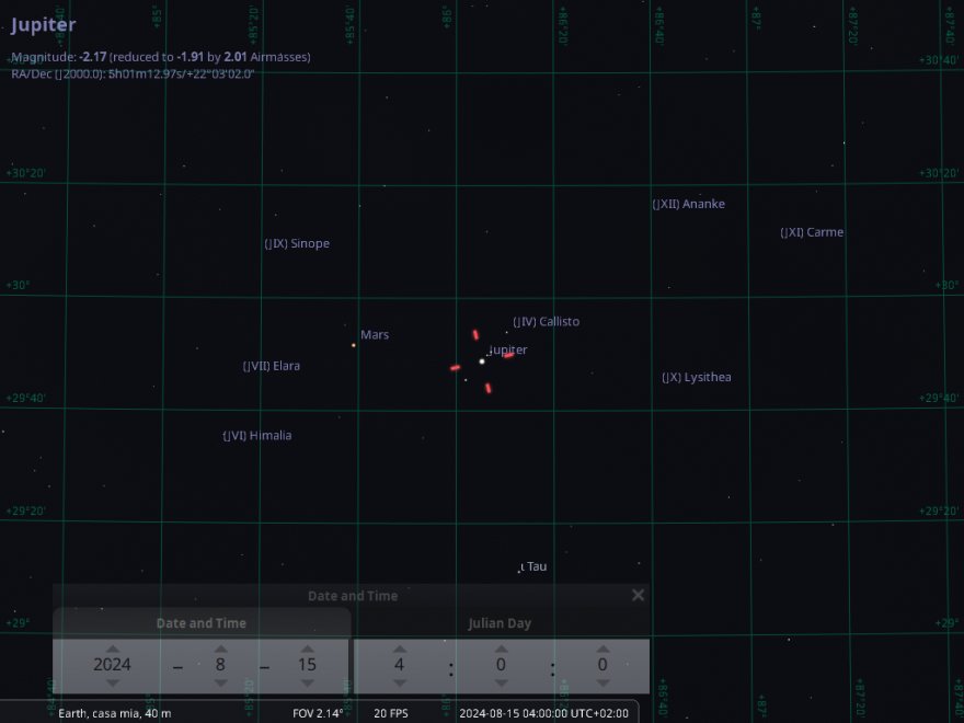 Vorrei segnalare un'interessante congiunzione tra il 14 ed il 15 agosto tra Marte ( più o meno a 20' quindi osservabile nello stesso campo oculare ), che inizia ad avere un diametro sufficiente per vedere qualche particolare, e sua maestà Giove.