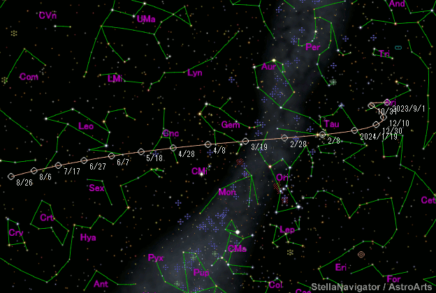 Nei mesi di gennaio e febbraio la cometa transiterà apparentemente tra le costellazioni del Leone e della Vergine, visibile quindi dalla metà della notte.