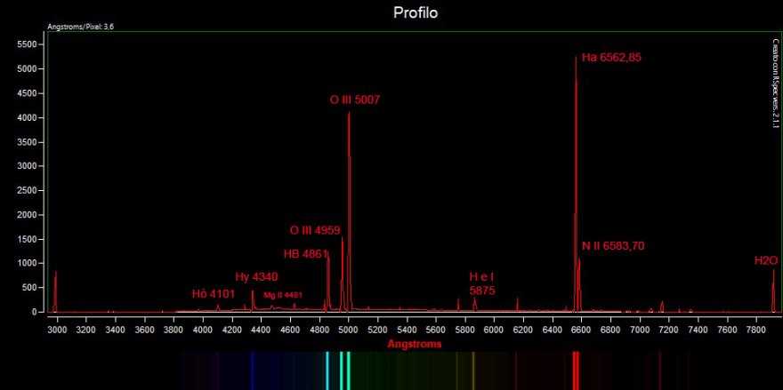 Ciao Rey giusta osservazione…su quel dato sono molto perplesso poiché il software nella ricerca degli elementi mi ha riconosciuto un’emissione di H2O, ma in realtà essendo una nebulosa non dovrebbe esserci atmosfera, per cui è un dato sicuramente errato che poi ho tralasciato di correggere ( ma lo farò a breve) , però voglio esaminare altri spettri in rete per vedere se qualcuno l’ha rilevata.