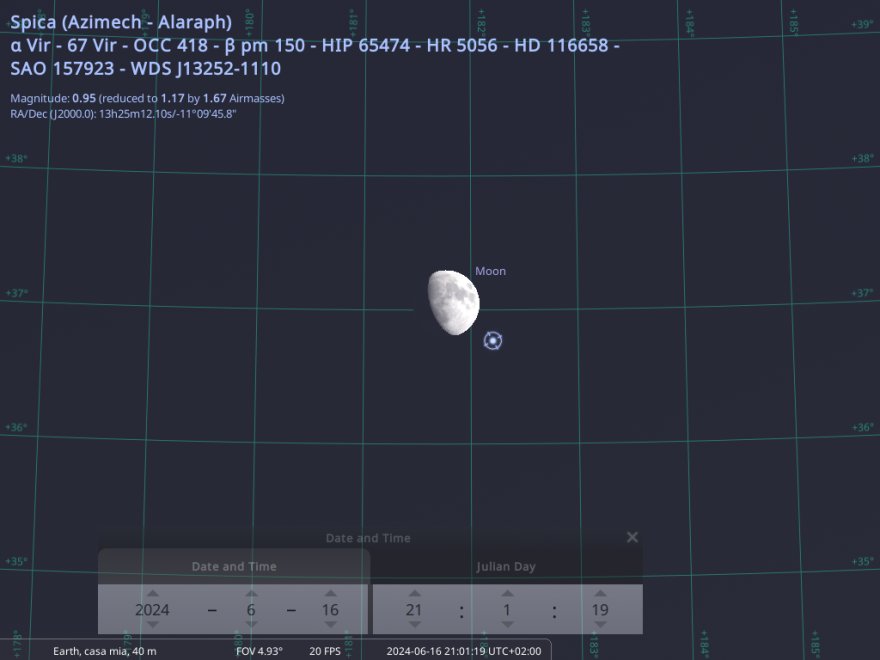 vi volevo segnalare per la sera del 16 giugno una stretta congiunzione tra la Luna (in fase gibbosa crescente) e Spica, l'alfa della costellazione della Vergine, di prima magnitudine.