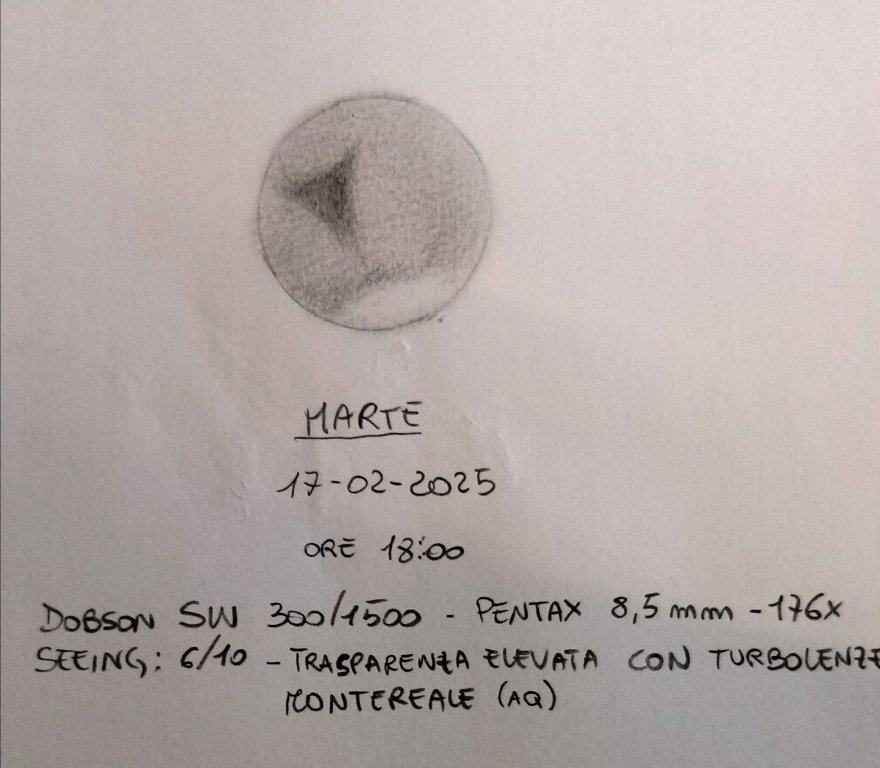 Dopo tante peripezie, finalmente riesco a piazzare fuori il dobson per una serata veloce. Procedo prima con lo star test, postumo al cambio di focheggiatore. Tutto regolare, nonostante tangibili turbolenze in quota seppur con alta trasparenza, il disco di Airy era a posto. Sposto velocemente quindi l'attenzione su Marte, bello alto nel cielo. Monto il pentax 8.5mm, un bellissimo oculare. Marte appariva come un bel tondino rosato, seppur tremolante a causa delle turbolenze in quota, immediatamente visibili un'area scura vagamente triangolare e la calotta polare più chiara. Mai visti tanti dettagli marziani in una serata dal seeing poco favorevole. Allego un disegno al volo di ciò che ho visto. È poco più di uno scarabocchio ma spero renda l'idea ;)Allegato 54774