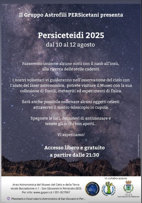 Nelle serate del 10/11/12 agosto 2025 intervenite tutti a S. Giovanni in Persiceto (BO) a vedere le stelle, e tanto altro.