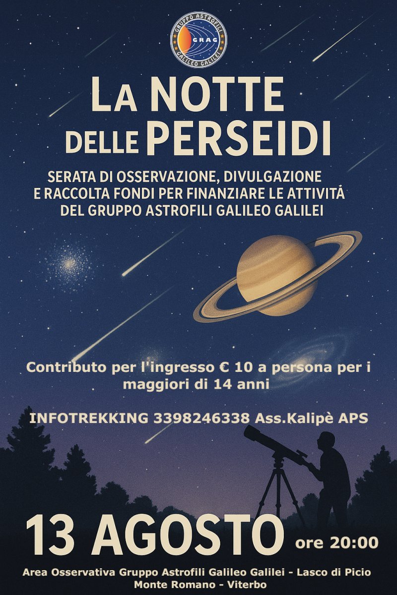 Unisciti a noi per una serata speciale sotto le stelle! In occasione del massimo dello sciame meteorico delle Perseidi, il Gruppo Astrofili Galileo Galilei ti invita a una serata di osservazione astronomica aperta a tutti: appassionati, curiosi e famiglie.