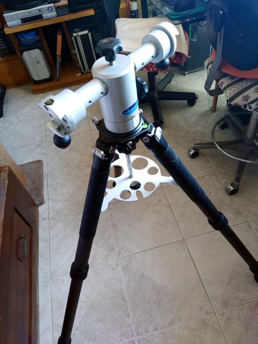 Oltre alla piastra piana, trovo utile la culla per la mezza-sfera (che ha sotto il "buco") visto che tramite questa posso alloggiare sia la EQ5 che la Giro3, con il normale attacco M10 e anche col distanziatore a corredo del treppiede in acciaio della EQ5 per irrigidire il tutto, anche considerato che la userò con le gambe aperte a 50° (2° dei 3 step angolari) per questione di stabilità, intendiamoci non porterà mai 40 kg dichiarati (almeno in ambito "astrofilesco"), ma se si estrae una sola delle tre sezioni, 15 kg in maniera solida li porta tutti senza problemi, il tutto in poco meno di 3 kg.