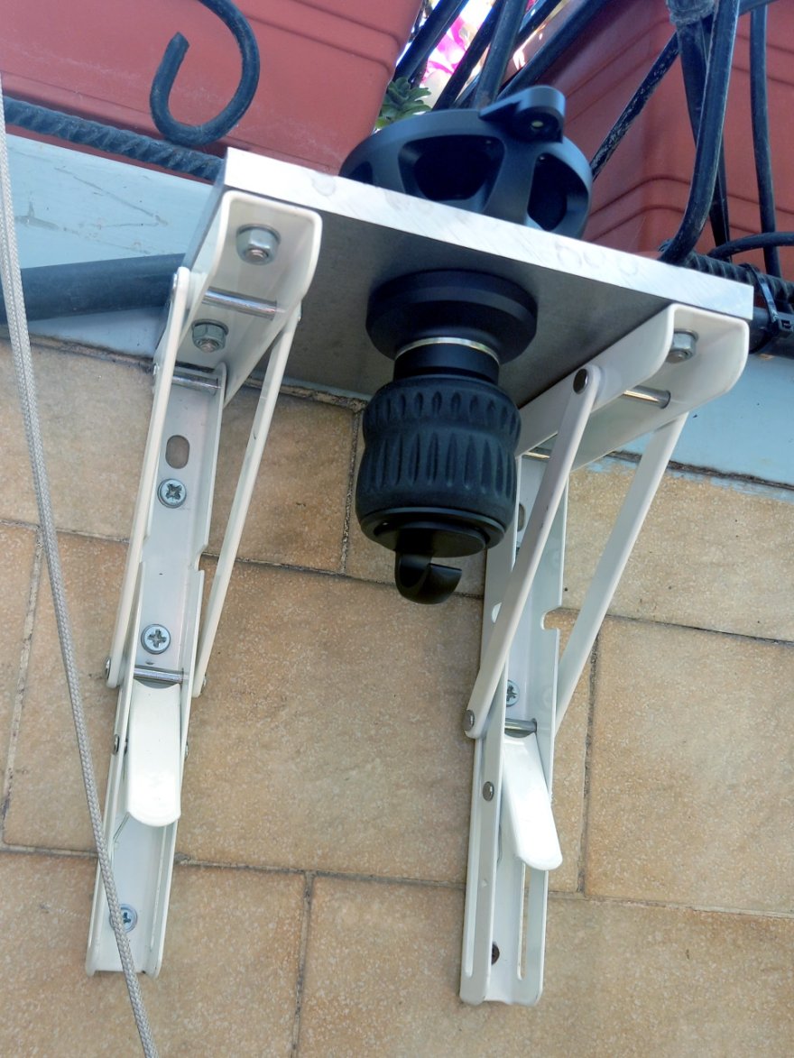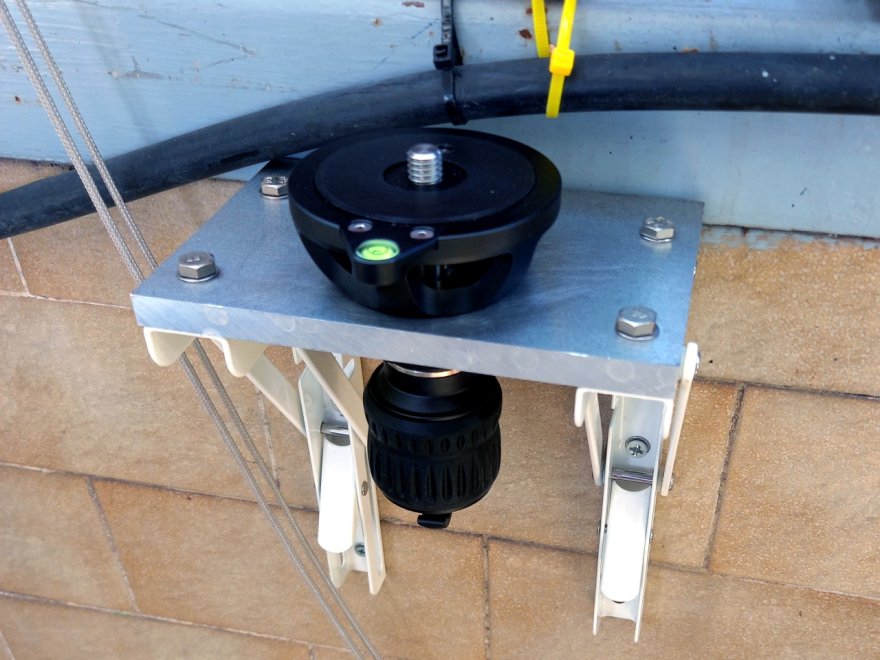 Le "mensole" che ho sul balcone sono state convenientemente forate per il passaggio di una vite M10, che ovviamente va più che bene anche per una 3/8" che ha un diametro molto simile (10 mm vs 9,52 mm), la mezza-sfera ha la base inferiore piatta, quindi posso innestarla sulla mensola senza problemi.