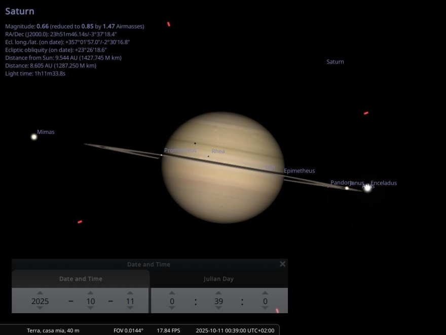 Venerdì 10 ottobre ho iniziato a riprendere Saturno con il C8 e asi 224 MC. Seeing molto buono che mi ha permesso di fare queste due riprese. La seconda, effettuata alle 00,39 dell’11 ottobre, mostra sulla sinistra l’ombra del satellite Rea.