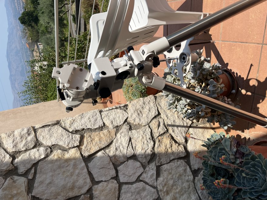 Per informazione, quest’estate ho modificato una EQ5 da equatoriale ad AZ, che uso quando sono in vacanza. Funziona tutto (tra l’altro anche molto fluida) ma come prossimo passo voglio invertire l’orientamento della testa per ottenere un bilanciamento migliore. Per farlo, o mi armo di sega ed elimino il « dente « che individua il nord sul treppiede, oppure mi fabbrico una basetta in legno che lo « ingloba », sulla quale poi applicherò la testa. Non ho ancora deciso.