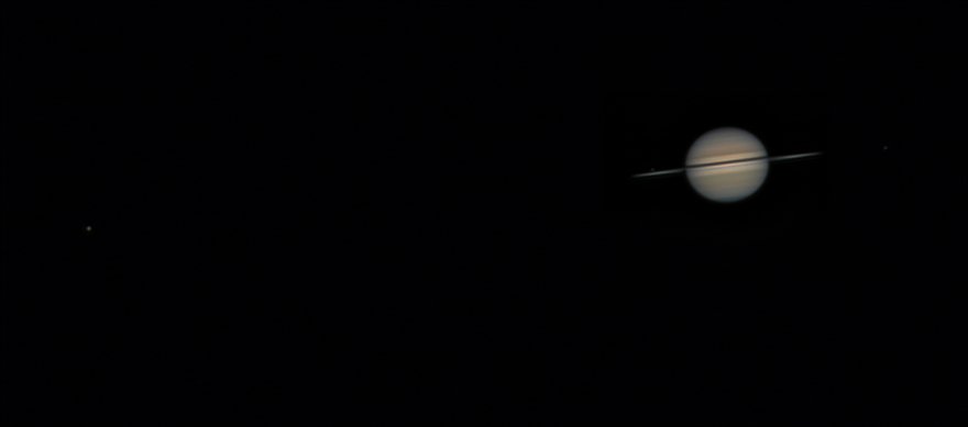 La seconda immagine riprende Saturno a largo campo con Titano, Rea sopra la fascia degli anelli a sinistra di Saturno e Dione a destra.