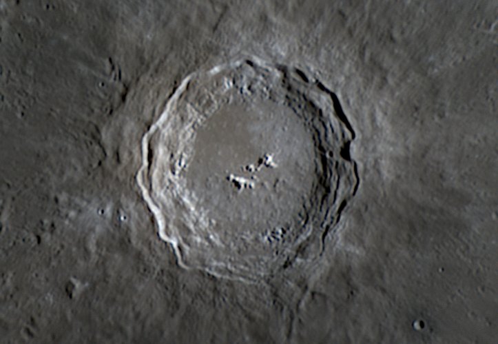 In fine il terzo cratere, ma in realtà ripreso per primo quando la Luna era ancora bassa, Copernicus. Uno spicchio del fondo del cratere che va dalle ore 9 a ore 12 ha una colorazione differente rispetto al resto, per una presenza e concentrazione di minerali diversa delle altre zone.