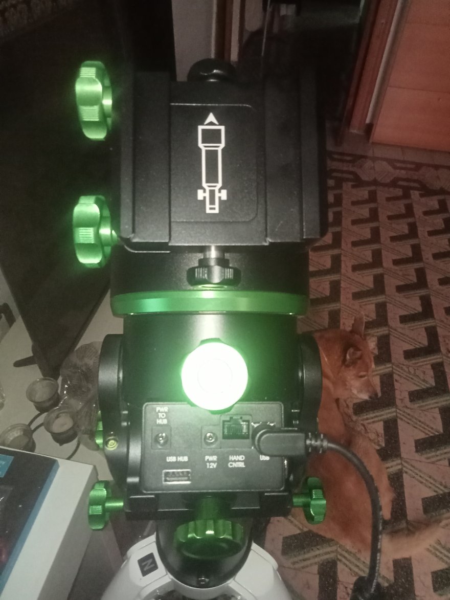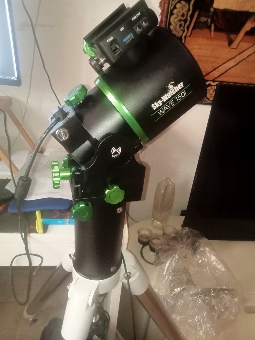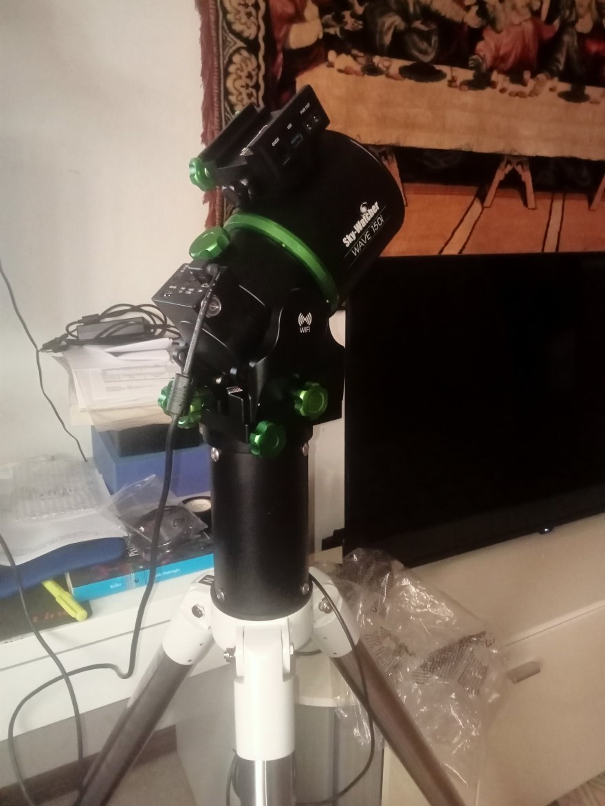 Ho scelto di fare il mio primo post non su una mia foto vecchia o recente ma sulla mia nuova montatura 150i wave della Skywatcher recentemente acquistata ad un prezzo che non avevo mai riscontrato prima di oggi in Italia (2.199 euro) pubblicando qualche foto e qualche impressione; essendo la prima volta spero di inserire le immagini in modo corretto; la prima impressione è la piacevole inconsistenza del peso e dello spazio occupato dalla valigetta contenente la montatura; la montatura si presenta in posizione altazimutale e quindi và diciamo equatorializzata; è molto semplice e intuitivo l'utilizzo delle manopole; io mi ero preventivamente fornito di mezza colonna e di treppiede EQ5 perchè la mezza colonna è necessaria per evitare le collissioni e per l'attacco tra treppiede e montatura, mentre il treppiede EQ5 è più economico e più stabile di quello in carbonio consigliato dalla marca; le manopole sono molto fluide ma quelle delle frizioni non vanno toccate per evitare qualsiasi giogo indesiderato. Ho alimentato la montatura con uno switching 12 v 10 a e la montatura collegata ad Asiair (sia col cavo eqmod o sia col cavo Usb) ha preso a girare; il wifi ci ha messo un pò di tempo ad attivarsi. Poi mi sono accorto che la posizione di home restituiva delle coordinate strane -55° nell'emisfero sud e quindi praticamente la montatura era fortemente disallineata; dopo varie accensioni e spegnimenti e dopo aver capito che c'era una funzione auto-home dell'APP Synscan Pro che correggeva questo problema mi sono accorto che il problema era andato via e che la montatura puntava correttamente al nostro polo sul planetario di Asiair; forse devo aver cancellato dal menù ibernazione qualche settaggio errato. La montatura ha 2 alimentazioni ausiliari per i vari devices (fasce di condensa, flat panel, , ecc..) che si vogliano utilizzare, ma le 2 aux powers non sono alimentate dalla presa pwr 12v input della montatura, come verrebbe logico pensare, ma da una seconda presa che si chiama pwr to hub; questo testimonia come la corretta alimentazione della montatura è ritenuta fondamentale dalla ditta costruttrice tanto è vero che il tasto di accensione si illumina e restituisce diversi tipi di alert tra cui quello di bassa o insufficiente carica di alimentazione.