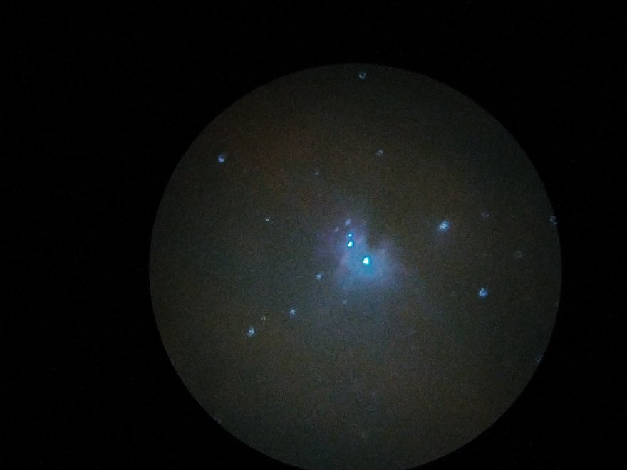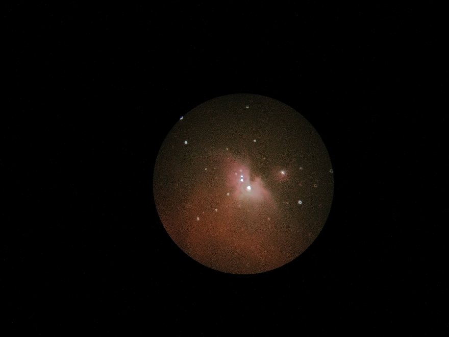 Location: il balcone di casa, e il target della serata in realtà era provare a prendere M31, ma per ragioni che non starò qui a elencare l'ho mancata di mezzora...e quindi per non buttare la serata ho cominciato a puntare oggetti a caso tra quelli visibili nel settore di cielo che ho a disposizione. Prima Saturno, e il seeing sembrava davvero buono...e quindi decido di stare fuori al fresco ad aspettare Orione. Circa alle 23.45 teoricamente "sorge" sopra il tetto del condominio di fronte (da miei calcoli con Stellarium), e quindi comincio a cercarla...e la trovo (facile...più facile di M31, in realtà). Un bagliore intorno a un campo stellare del quale riconosco sia posizione che asterismi...e quindi attacco il motore e collimo la fotocamera del telefono con l'obiettivo H20 (che non sarà granché ma almeno l'avevo smontato e pulito dalla polvere...e la cosa ha aiutato a migliorare la qualità dell'immagine!).