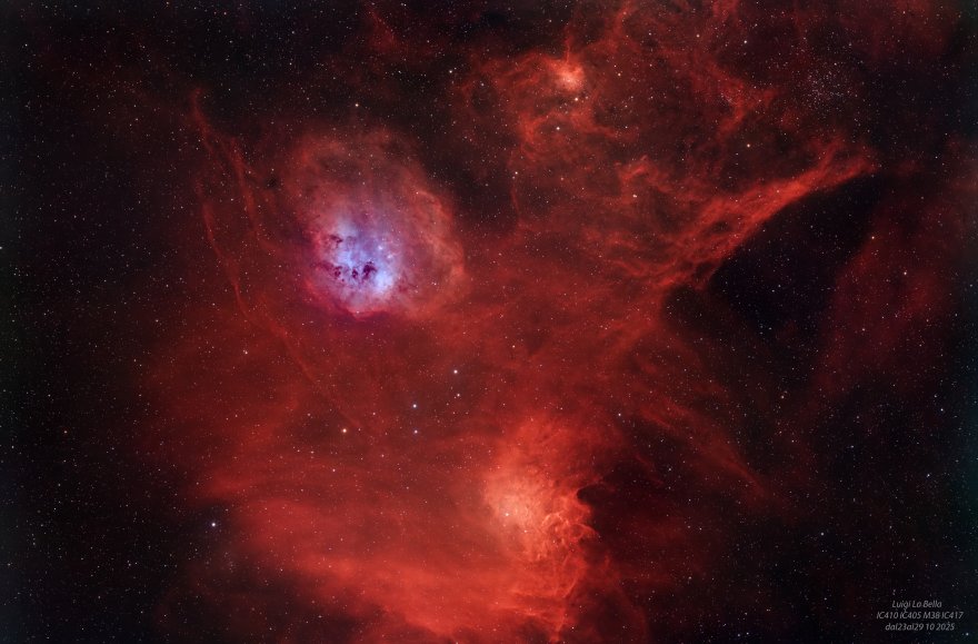 Queste nebulose sono principalmente a emissione, ricche di idrogeno e sono luoghi di intensa formazione stellare, rendendole soggetti popolari per l'astrofotografia, specialmente per chi usa come nel mio caso focali medio-corte e filtri a banda stretta.