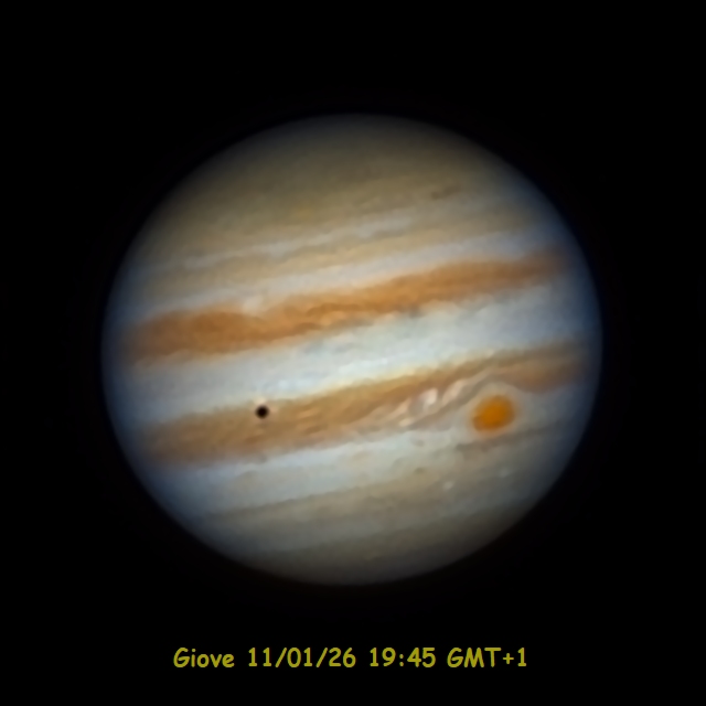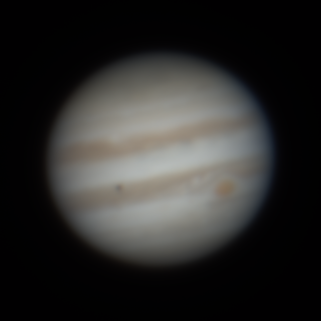 Dopo cena ho elaborato una delle riprese che sembrava potesse dare qualche soddisfazione, su Giove si nota la macchia rossa seguita da Europa. L'ombra del satellite è a sinistra, quasi a contatto con Europa. Purtroppo il satellite è quasi invisibile nell'immagine, si nota appena solo sapendo dove guardare. Speriamo in questi giorni di trovare un'atmosfera meno agitata.