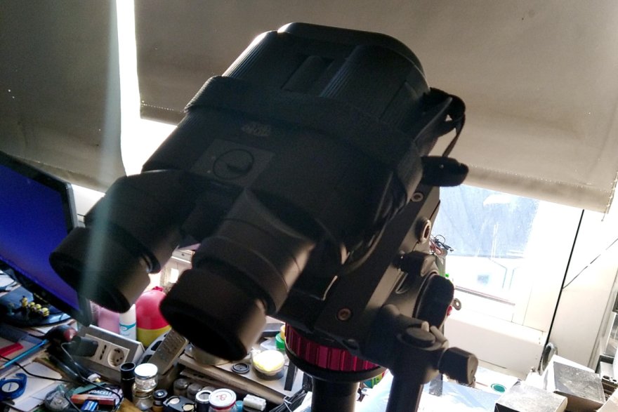 Apparecchio il "binato" per confrontare il Fuji con i miei due binocoloni, uno per il confronto a (quasi) parità d'ingrandimento (il William Optic) e l'altro per il confronto a parità di P.U. (il "Doc").