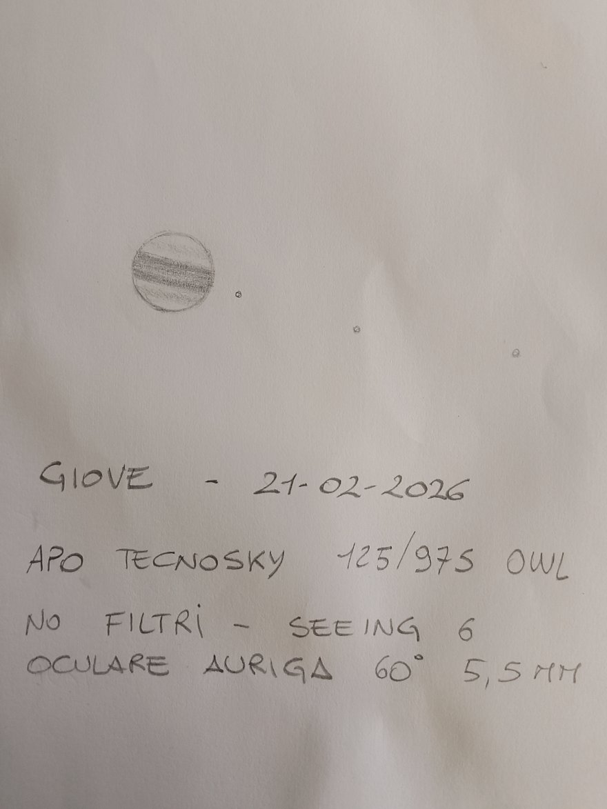 Questo obiettivo non aveva mai visto la luna da quando l'ho comprato, mai...sabato scorso, complice un seeing piú che sufficiente nonostante qualche velatura e una falce di luna bella alta, il tele ha mostrato una definizione sui dettagli lunari a dir poco spaventosa, in senso buono chiaramente. Ho potuto spingere con gli ingrandimenti senza alcun decadimento, i dettagli più fino subito riconoscibili. Poi ho pensato che Giove nel frattempo aveva raggiunto anch'esso un'elevazione nel cielo interessante...anche qui ad ingrandimenti sui 180x, al momento non ho oculari planetari di focale più corta e allo stesso tempo con comoda estrazione pupillare, pensavo infatti a una buona Barlow...ecco a voi uno schizzo molto abbozzato...tanti dettagli subito visibili, non male per soli 125mm di apertura!Allegato 56089