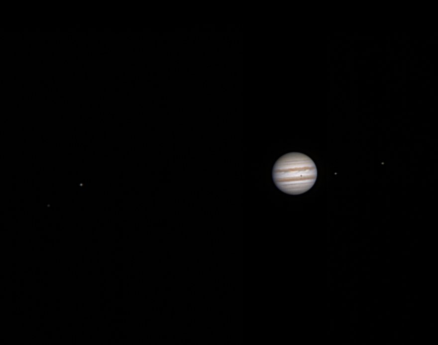 Finalmente, dopo molto tempo, sono riuscito a riprendere il gigante gassoso con le sue 4 lune medicee. Anche se č ormai lontano dall'opposizione, il pianeta puņ mostrare comunque dettagli delle sue bande atmosferiche anche con piccoli telescopi, questo grazie alle sue enormi dimensioni reali e al suo grande diametro apparente, che lo rendono ben visibile quasi tutto l'anno.