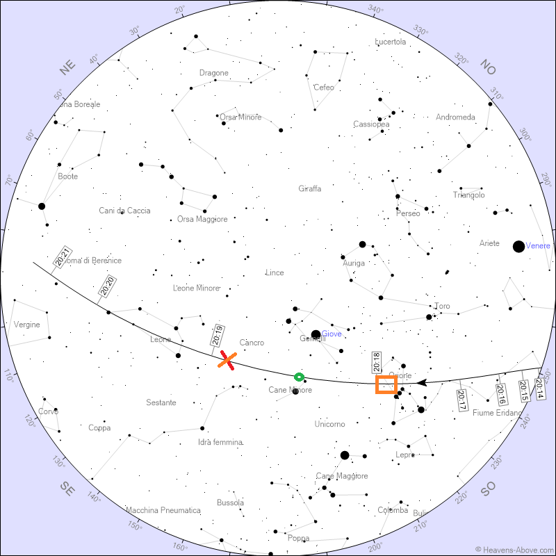 mentre pensavo a queste cose abbastanza inconsuete butto uno sguardo verso Orione ed ecco che (in un cielo splendidamente scuro e senza nuvole!) appariva un bagliore, un lampo, quello che fino ad anni fa era un flare, in corrispondenza del quadratino arancione, lungo l'orbita prevista per la CSS minuti prima.