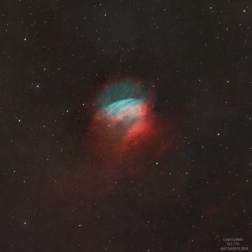 Il meteo è ancora altalenante ma riesco a riprendere nuovamente in più serate e con un altro tele la nebulosa planetaria sh2-174,oggetto molto debole che richiede molte ore di integrazione.