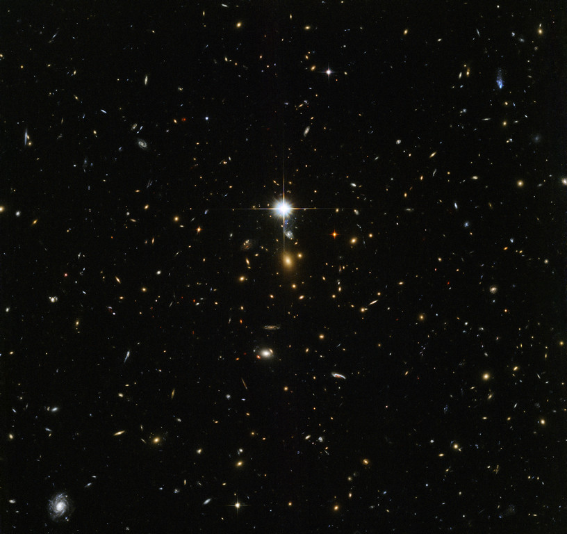 Si trova nella costellazione della Balena, ad una distanza di oltre 7 miliardi di anni luce dalla Terra, ed è stato ‘battezzato’ con un complesso codice alfanumerico che sembra quasi una password. Si tratta di Whl J24.3324-8.477, un massiccio cluster galattico il cui centro è stato recentemente ritratto da Hubble con gli strumenti Acs (Advanced Camera for Surveys) e Wfc3 (Wide-Field Camera 3). L’immagine inquadra una porzione di spazio affollata di galassie che spiccano come punti luminosi sullo sfondo scuro e dominata da due oggetti particolarmente brillanti: il primo, che sembra un flash fotografico, è una stella mentre il secondo, situato proprio al centro dell’immagine, è il cuore dell’ammasso Whl J24.3324-8.477 che include anche la propria galassia più splendente