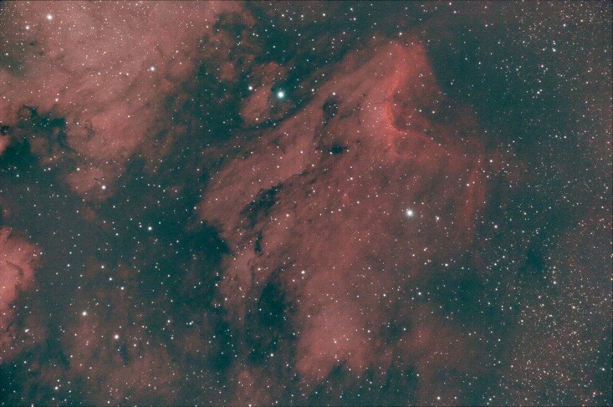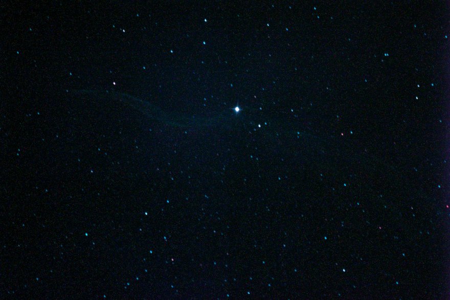 Monto il filtro sul Visac, a piena focale e provo una ripresa del velo a ridosso di 52 Cygni. Provo una prima posa da 600s a 1600ISO. Mi aspetto un risultato interessante, ma quello che ottengo è un fotogramma così (non fate caso al mosso, ho toccato inavvertitamente il tele)