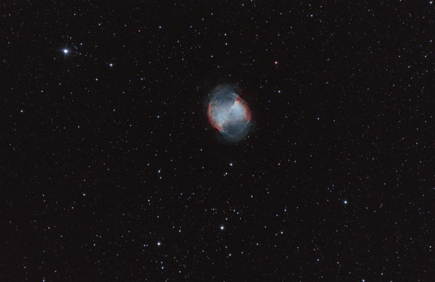 Un po' deluso, provo allora su M27, la planetaria più facile del cielo boreale. Riprovo con un test da 10 minuti a 1600ISO e qui fortunatamente un po' di segnale c'è. Faccio una breve sequenza di 15 scatti da 600s l'uno a 1600ISO con la Canon 5D e alla fine, riesco a estrarre qualcosa dal mostruoso rumore di fondo di ogni singola immagine.