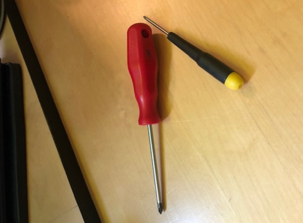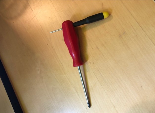 Come piccolo trucco per avere piu'controllo su frazioni di giro uso l'aggeggio in foto. Due cacciaviti incastrati: il piccolo usato come maniglia, quello grande per girare le viti. Una piccola stupidaggine, ma aiuta. Metto anche un giro di scotch per proteggere la punta scoperta, giusto per sicurezza.