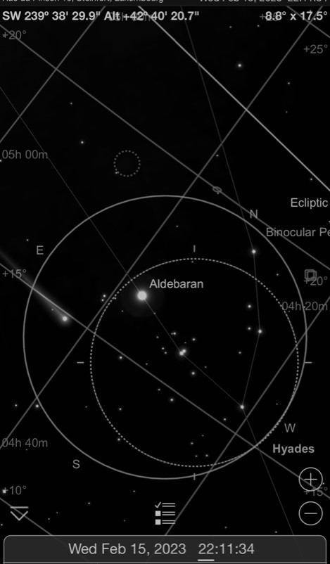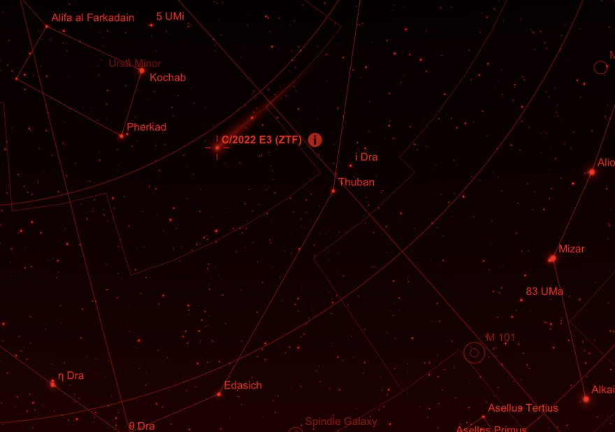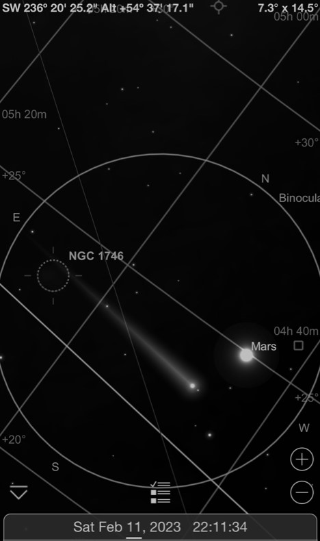 Nelle serate dell'11 e 15 Febbraio dovrebbero esserci bei passaggi della C/2022 E3 (ZTF) in prossimita', rispettivamente, di Marte e delle Iadi. La magnitudine stimata da SkySafari e' intorno a 7.