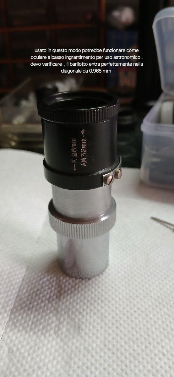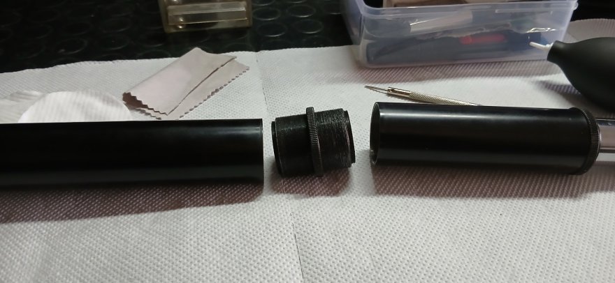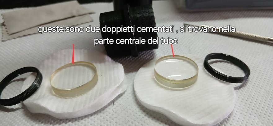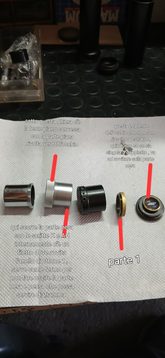 Per @Angelo_C ho smontato il tubo erettore , ma non sono riuscito ad estrarre la lente dell'occhio , quindi non so se sia una lente singola oppure un doppietto , la lente di campo è singola con la parte piana rivolta verso l'occhio , l'anello in ottone che vedi in foto oltre a funzionare da fermo per la parte nera che scorre sulla parte cromata , credo che faccia anche da diaframma di campo , mentre i due doppietti che si trovano nella parte centrale del tubo credo che facciano da raddrizzatore d'immagine , le foto con descrizione lasciano capire meglio .