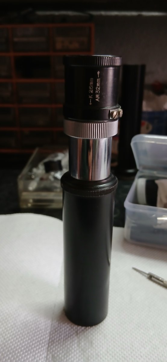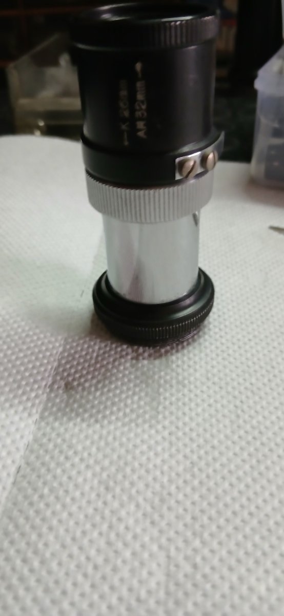 Il secondo oggetto è semplicemente un oculare erettore per il terrestre , non mi è chiaro ancora un punto che dovroʻ scoprire , sull' oculare è inciso , K 26 , AH 32 , ora l'oculare funziona tipo uno zoom , la parte nera scorre su quella cromata , schiacciandolo nel verso della freccia , dovrebbe funzionare il K 26 , tirandolo verso l'esterno dovrebbe funzionare il AH 32 , ora il K dovrebbe riferirsi al Kellner mentre il AH al Huygens Acromatico , il K ha tre lenti mentre il AH dovrebbe avere una sola lente ,.