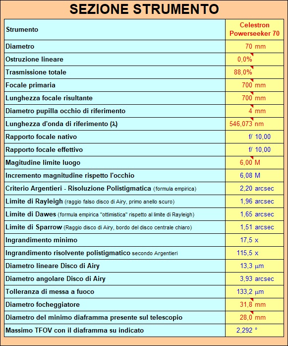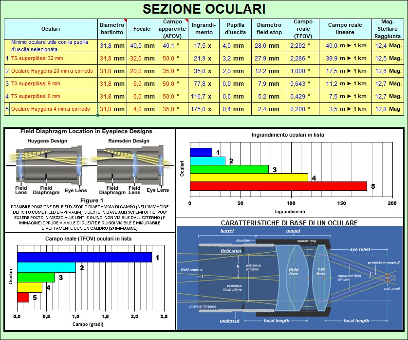 Questo è un esempio dei risultati dopo aver inserito i dati dello strumento e degli oculari.